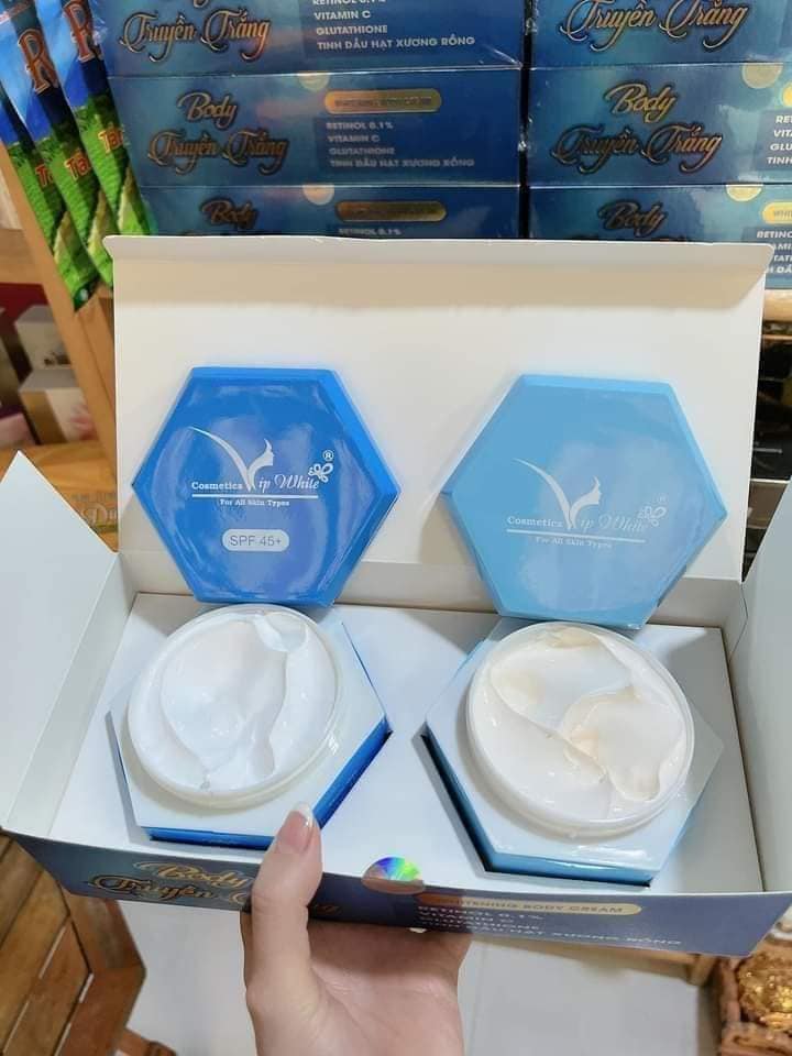 Combo Kem body truyền trắng vip white với thành phần chính là Retinol 0,1%, Vitamin C, Glutathione, Dầu hạt xương rồng, Collagen.