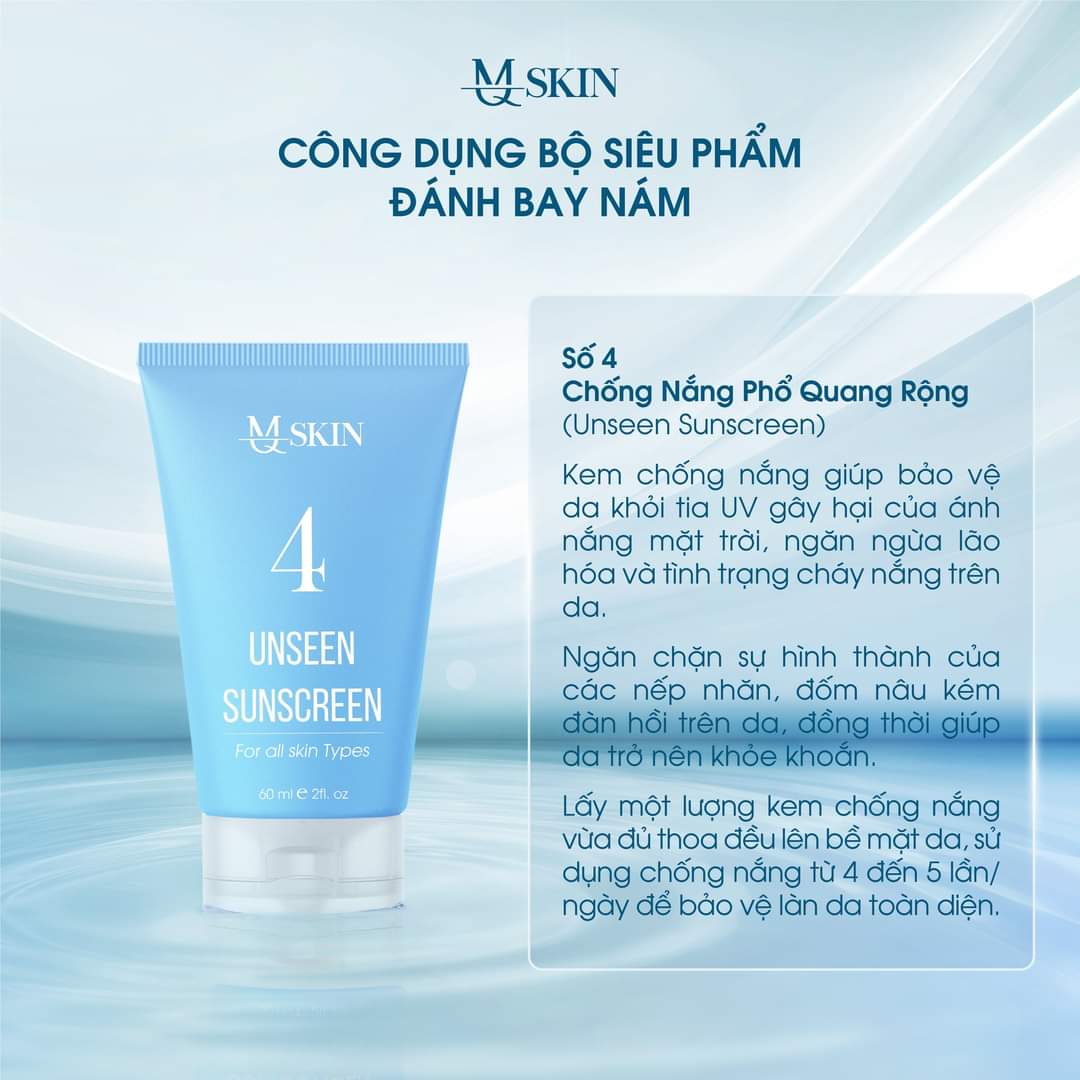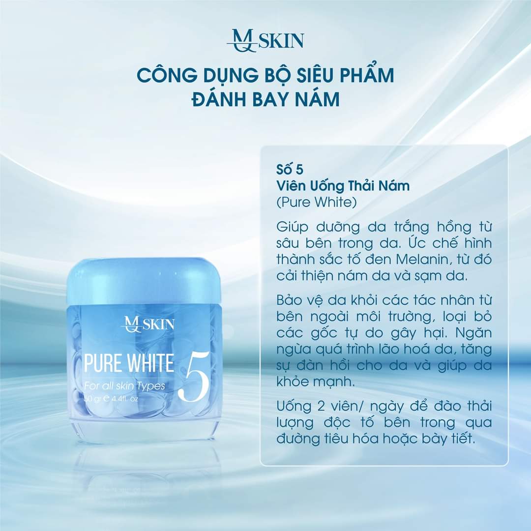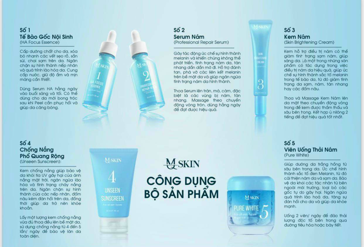 Tất cả hội tụ trong bộ 5 sản phẩm hỗ trợ điều trị - “đánh bay” nám của MQ Skin, mang lại loạt tác dụng gần như tuyệt đối trong vấn đề ngăn ngừa nám, mờ tàn nhang, cung cấp những dưỡng chất cần thiết cho da, xóa bỏ sẹo rỗ sần sùi, dưỡng ẩm, se khít lỗ chân lông, bảo vệ da khỏi tia UV, tránh tác động của tia cực tím, ngăn ngừa lão hóa da…